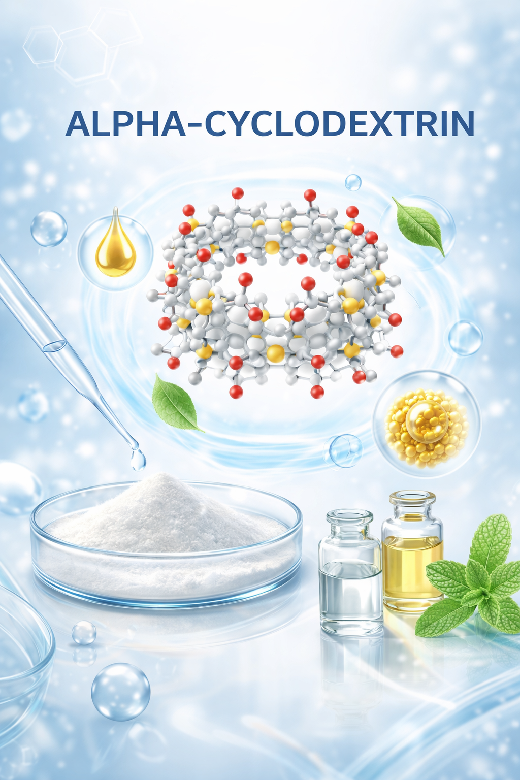 Alpha-Cyclodextrin có cấu trúc hình nón cụt, bề mặt ngoài ưa nước nhưng khoang rỗng bên trong tương đối kỵ nước. Nhờ đó, nó tạo được phức bao hàm với các hoạt chất phù hợp kích thước, giúp tăng độ tan biểu kiến, bảo vệ hoạt chất khỏi oxy hóa hoặc quang phân hủy, đồng thời hỗ trợ giải phóng có kiểm soát. Do chỉ có 6 đơn vị glucose, α-cyclodextrin có khoang nhỏ hơn β- và γ-cyclodextrin, nên phù hợp hơn với các phân tử khách có kích thước nhỏ.
