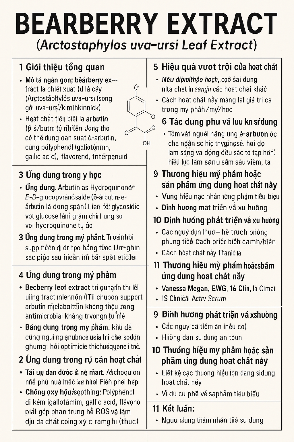 Mô tả ngắn gọn: Bearberry extract là chiết xuất từ lá cây Arctostaphylos uva-ursi (còn gọi uva-ursi/kinnikinnick). Hoạt chất tiêu biểu là arbutin (β-arbutin tự nhiên; đồng thời có thể dùng dẫn xuất tổng hợp α-arbutin trong mỹ phẩm), cùng polyphenol (gallotannin, gallic acid), flavonoid, triterpenoid.