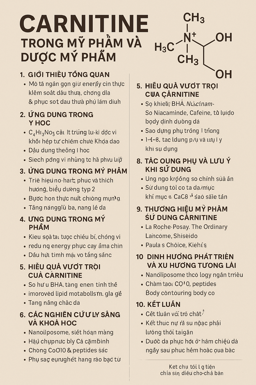 Trong mỹ phẩm hiện đại, Carnitine được xem như “người điều phối năng lượng tế bào”, đặc biệt phù hợp cho da dầu – da mụn – da mệt mỏi hoặc da đang phục hồi.