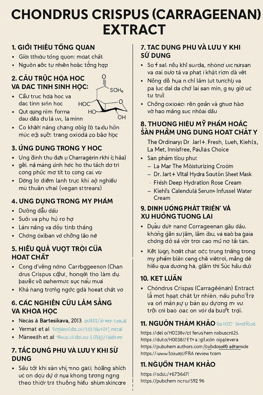 Cấu trúc hóa học: Chondrus Crispus chứa carrageenan, là một nhóm sulfated polysaccharides (đường đa sulfat hóa) bao gồm các đơn vị galactose và anhydrogalactose liên kết β-(1→4) và α-(1→3).