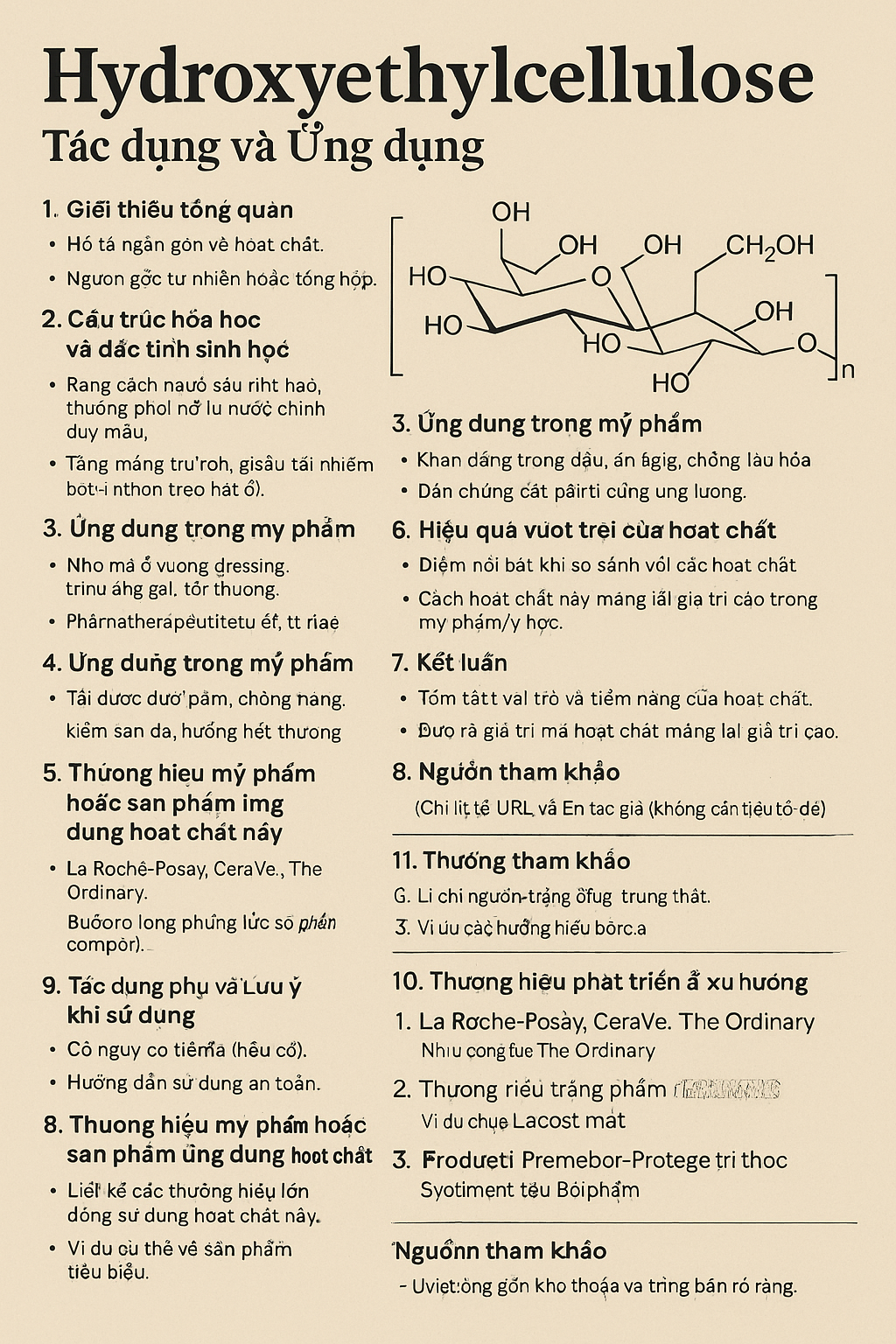An toàn da liễu (CIR): Hội đồng Cosmetic Ingredient Review đánh giá HEC và các dẫn xuất an toàn trong điều kiện sử dụng hiện nay; không gây độc gen – không nhạy cảm trong dữ liệu thử nghiệm chuẩn. URL: https://journals.sagepub.com/doi/10.1080/1091581010037396 — Andersen.