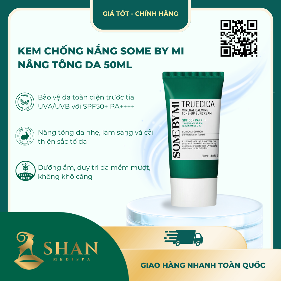 Kem Chống Nắng Some By Mi Nâng Tông Da 50ml [Mẫu Mới] là sản phẩm chống nắng vật lý đến từ thương hiệu Some By Mi (Hàn Quốc), thiết kế chuyên biệt cho làn da nhạy cảm, dễ mụn. Với SPF50+ PA++++, sản phẩm bảo vệ da hiệu quả trước UVA/UVB, kết hợp 85% tinh chất dưỡng ẩm giữ da mềm mượt suốt ngày dài. Sử dụng 100% màng lọc vật lý không chứa hạt nano, kem chống nắng này giúp nâng tông da nhẹ nhàng, giảm nguy cơ kích ứng. Kết cấu dạng kem-sữa lỏng nhẹ, thẩm thấu nhanh, không để lại vệt trắng, lý tưởng cho mọi loại da và tông da.