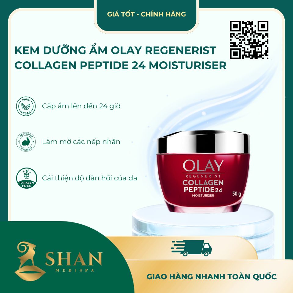 | Kết Luận | Kem Dưỡng Ẩm Ngăn Ngừa Lão Hóa Olay Regenerist Collagen Peptide 24 Moisturiser là lựa chọn hoàn hảo để duy trì và cải thiện làn da của bạn. Với công nghệ tiên tiến và thành phần dưỡng chất cao cấp, sản phẩm không chỉ cấp ẩm sâu mà còn ngăn ngừa lão hóa, giúp da trở nên săn chắc và tươi trẻ hơn. Hãy trải nghiệm sản phẩm tại các cửa hàng của Shan Medispa và trên website shanspa.vn để cảm nhận sự khác biệt! |