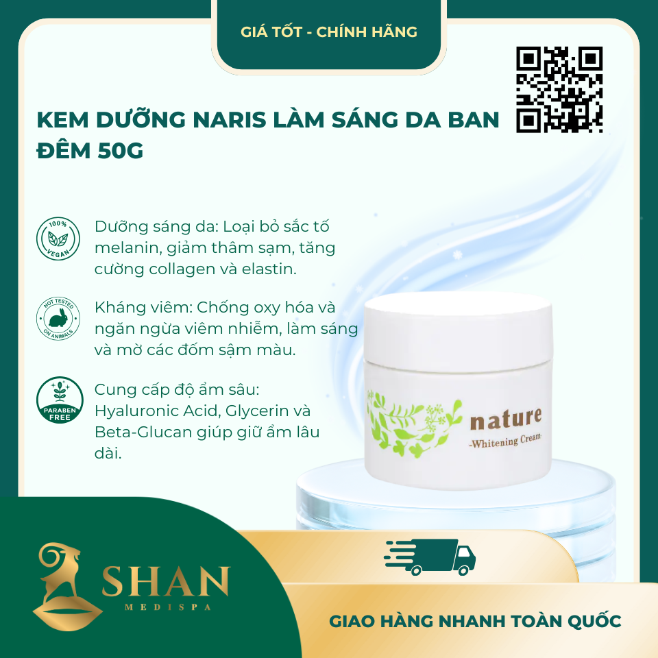 | Kết Luận | Kem Dưỡng Naris Làm Sáng Da Ban Đêm 50g là lựa chọn hoàn hảo cho những ai mong muốn sở hữu làn da sáng mịn, săn chắc và khỏe mạnh. Với công thức chiết xuất từ thiên nhiên và các thành phần dưỡng chất như Sữa Ong Chúa, Hoa Anh Đào, Tinh chất Trà Xanh, Betaine salicylate, Hyaluronic Acid, Glycerin và Beta-Glucan, sản phẩm không chỉ giúp dưỡng sáng mà còn cung cấp độ ẩm sâu, kháng viêm và làm chậm quá trình lão hóa da. Kem Dưỡng Naris Làm Sáng Da Ban Đêm mang lại làn da tươi sáng, mềm mịn và khỏe mạnh ngay sau lần sử dụng đầu tiên. Hãy đến với Shan Medispa hoặc truy cập shanspa.vn để trải nghiệm và sở hữu Kem Dưỡng Naris Làm Sáng Da Ban Đêm 50g, giúp bạn duy trì làn da sáng mịn, cân bằng và rạng rỡ mỗi ngày. |