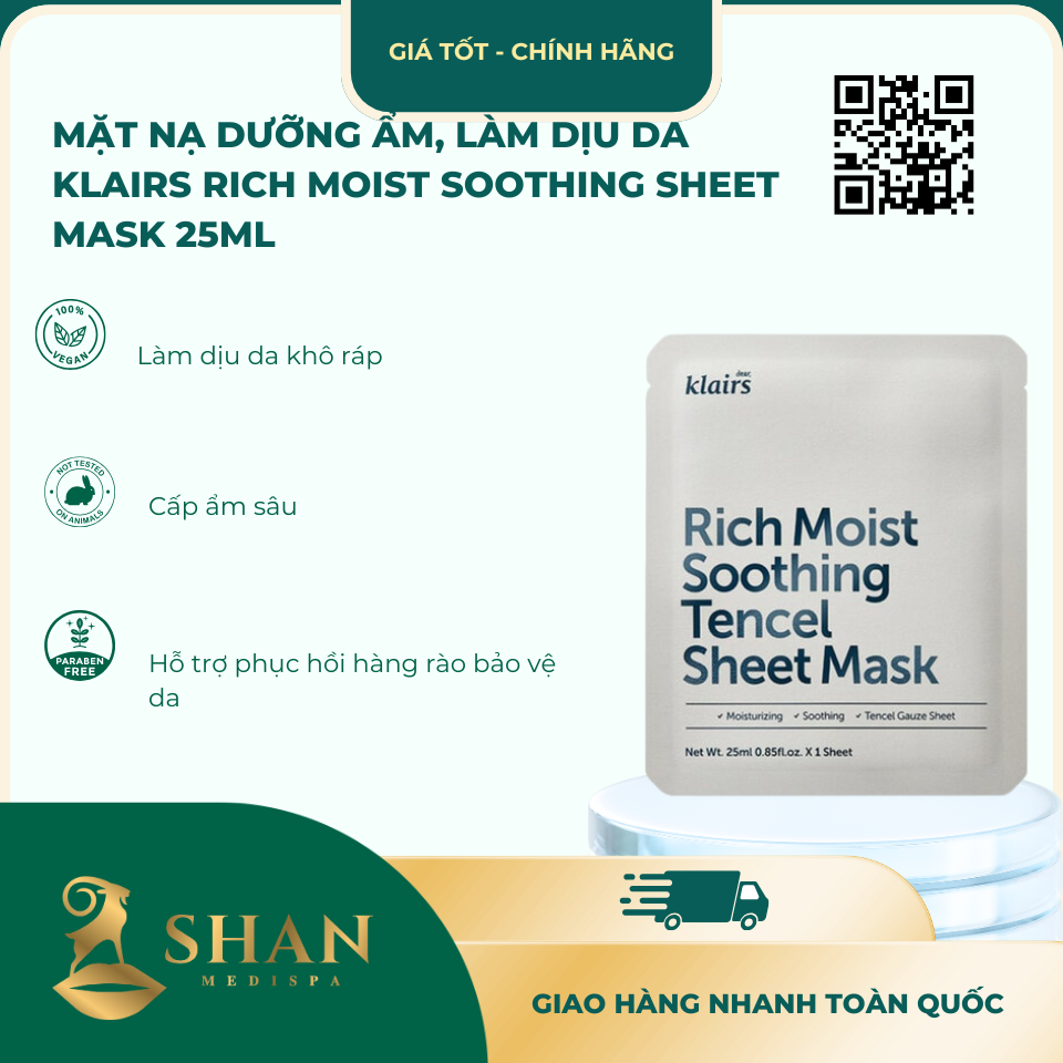 | Kết Luận | Mặt Nạ Dưỡng Ẩm, Làm Dịu Da Klairs Rich Moist Soothing Sheet Mask 25ml là sản phẩm hoàn hảo cho những ai mong muốn duy trì làn da mềm mại, mịn màng và khỏe mạnh. Với các thành phần tự nhiên và công nghệ vải cao cấp, sản phẩm không chỉ cấp ẩm sâu mà còn làm dịu da hiệu quả. Hãy trải nghiệm ngay tại các cửa hàng của Shan Medispa và trên shanspa.vn để cảm nhận sự khác biệt! |