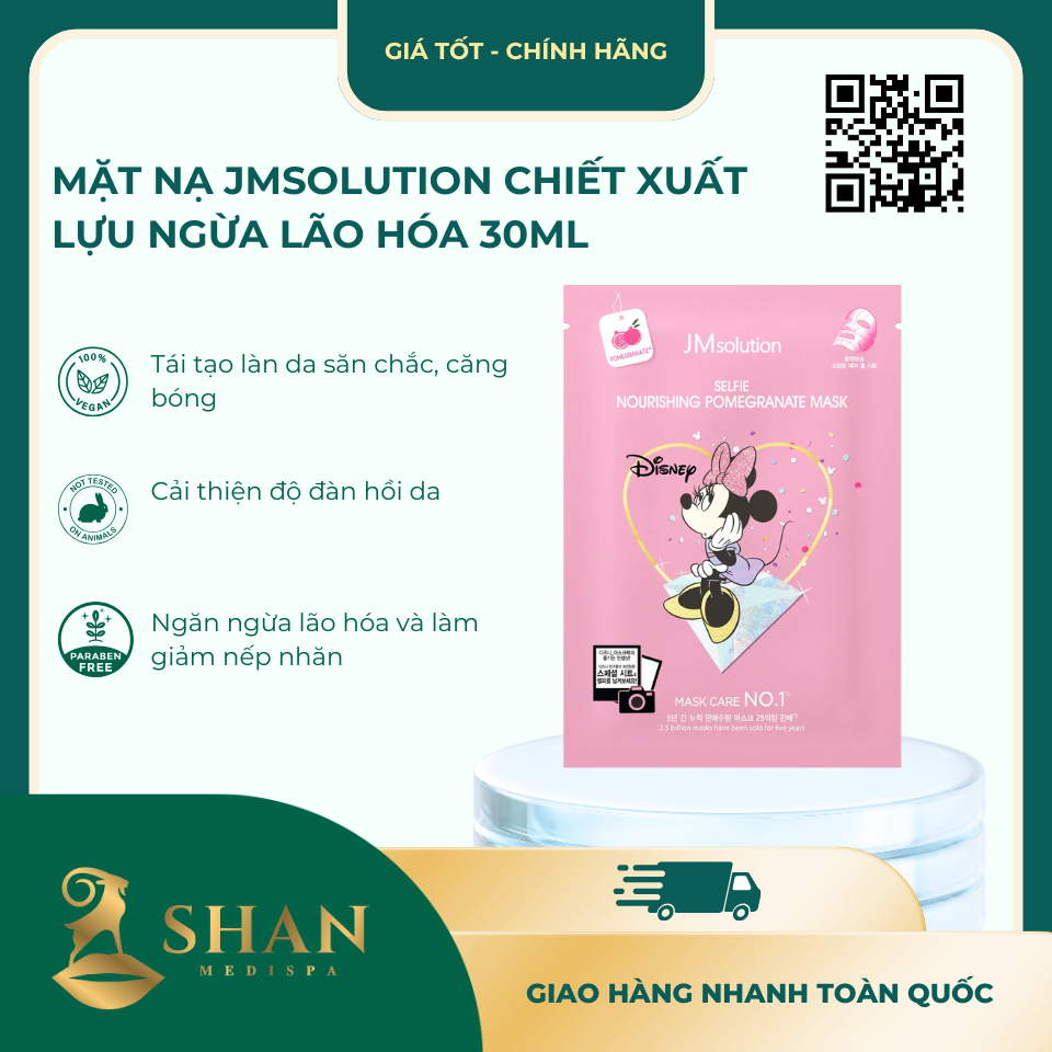 | Kết Luận | Mặt Nạ JMsolution Selfie Nourishing Pomegranate Mask là giải pháp lý tưởng cho việc ngăn ngừa lão hóa và tái tạo làn da săn chắc. Trải nghiệm ngay tại các cửa hàng Shan Medispa hoặc shanspa.vn để cảm nhận làn da tươi mới và sáng mịn. |