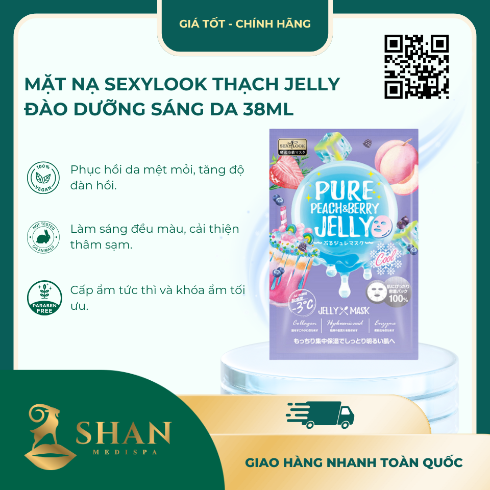Mặt Nạ Sexylook Thạch Jelly Đào Dưỡng Sáng Da 38ml là lựa chọn lý tưởng cho làn da xỉn màu, thâm sạm và cần phục hồi cấp tốc. Với phức hợp enzyme lên men, collagen, hyaluronic acid và chiết xuất trái cây, sản phẩm không chỉ cấp ẩm sâu mà còn làm sáng đều màu, cho da rạng rỡ tức thì. Hãy trải nghiệm ngay tại Shan Medispa hoặc đặt mua trên shanspa.vn để thấy rõ hiệu quả!