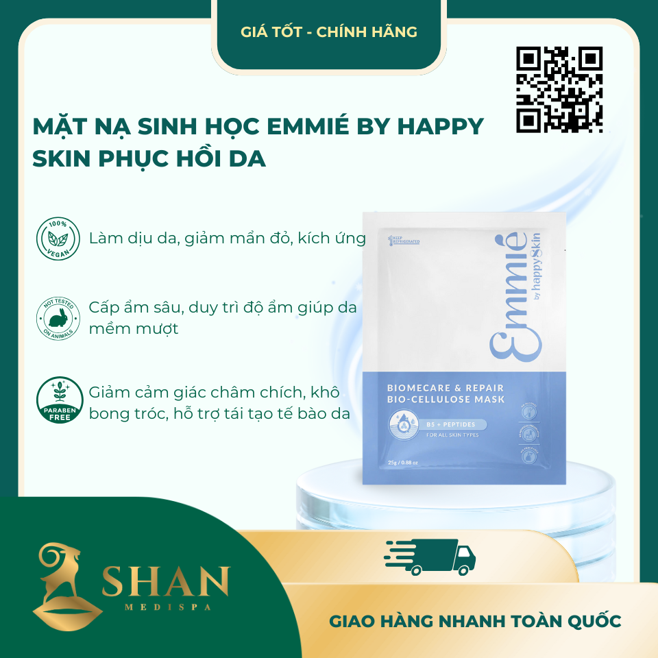 | Kết Luận | Mặt Nạ Sinh Học Emmié by Happy Skin Phục Hồi Da [Mẫu Mới] là lựa chọn hoàn hảo cho da nhạy cảm, thiếu ẩm, mẩn đỏ. Với thành phần B5, rau má, peptide và bio-cellulose thân thiện, sản phẩm giúp da ẩm mượt, giảm kích ứng và khỏe mạnh hơn. |
