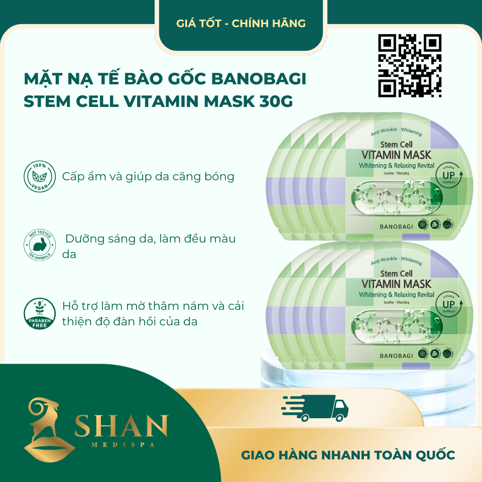 Mặt Nạ Tế Bào Gốc Banobagi Stem Cell Vitamin Mask 30g không chỉ giúp dưỡng sáng và cấp ẩm mà còn cải thiện cấu trúc da, se khít lỗ chân lông, và làm mềm mại da. Đừng bỏ lỡ cơ hội trải nghiệm sản phẩm tại các cửa hàng Shan Medispa và shanspa.vn!