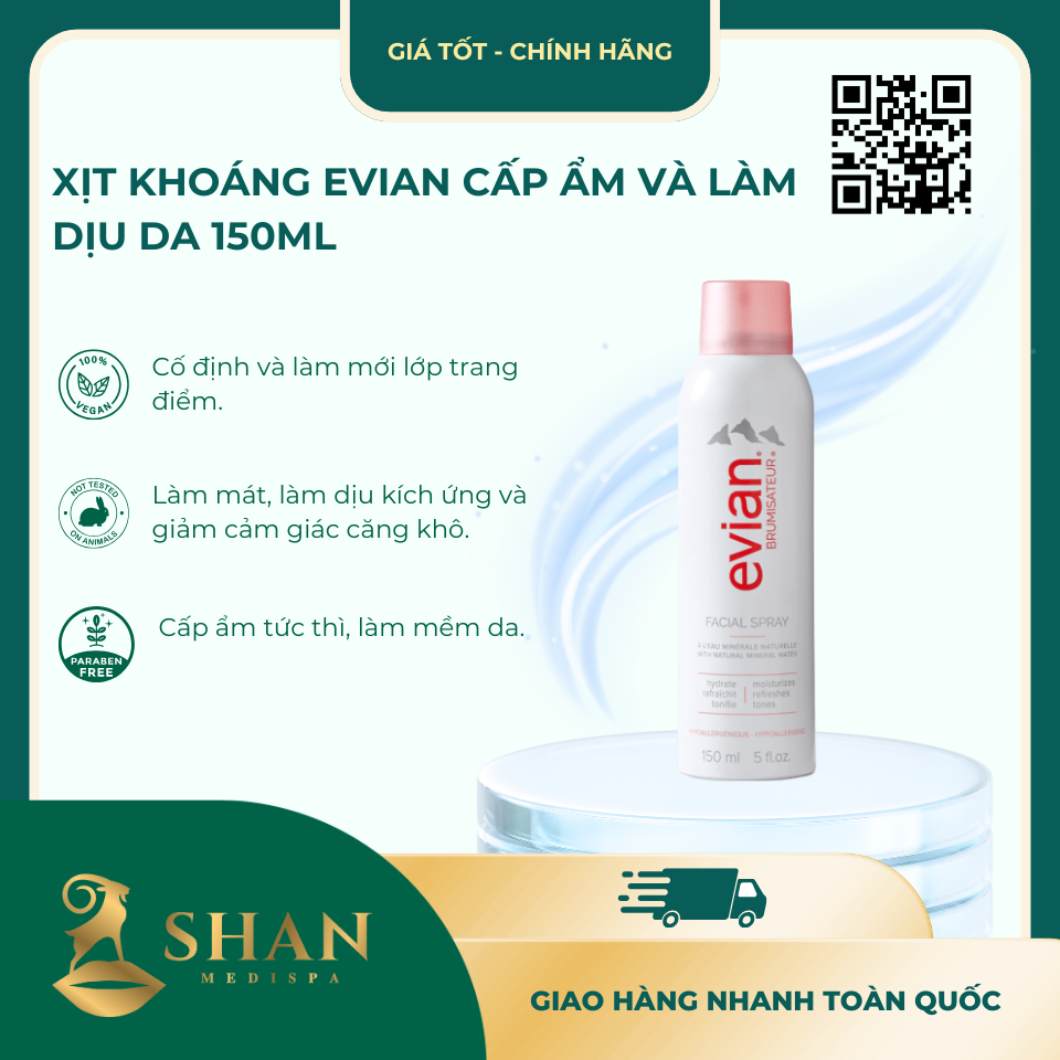Xịt Khoáng Evian Facial Spray 150ml là “bảo bối” cấp ẩm và làm dịu tức thì cho mọi loại da. Với tinh chất khoáng tự nhiên từ Alps và độ pH trung tính, sản phẩm không chỉ nuôi dưỡng da mà còn duy trì lớp trang điểm bền đẹp. Hãy trải nghiệm ngay tại Shan Medispa hoặc đặt mua trên shanspa.vn để tận hưởng làn da tươi mát, rạng rỡ bất cứ nơi đâu!